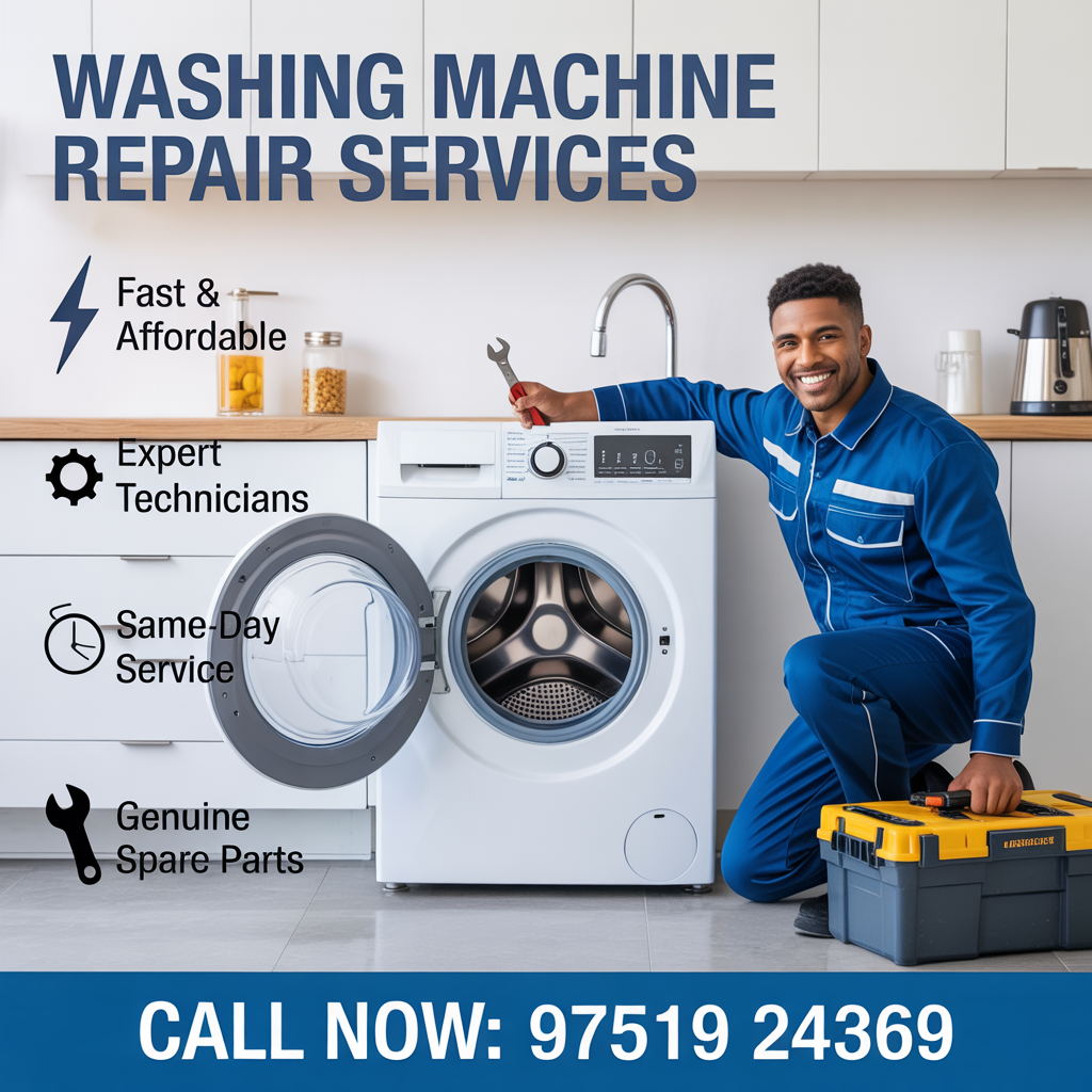 Expert washing machine repair services with fast response, genuine spare parts, and affordable pricing. We offer reliable and affordable washing machine repair services for all major brands and models. Our skilled technicians provide fast doorstep service for issues like water leakage, drum problems, noise, drainage, and power faults. With genuine spare parts, transparent pricing, and same-day service availability, we ensure your washing machine works like new. Call 97519 24369 for expert washing machine repair you can trust.